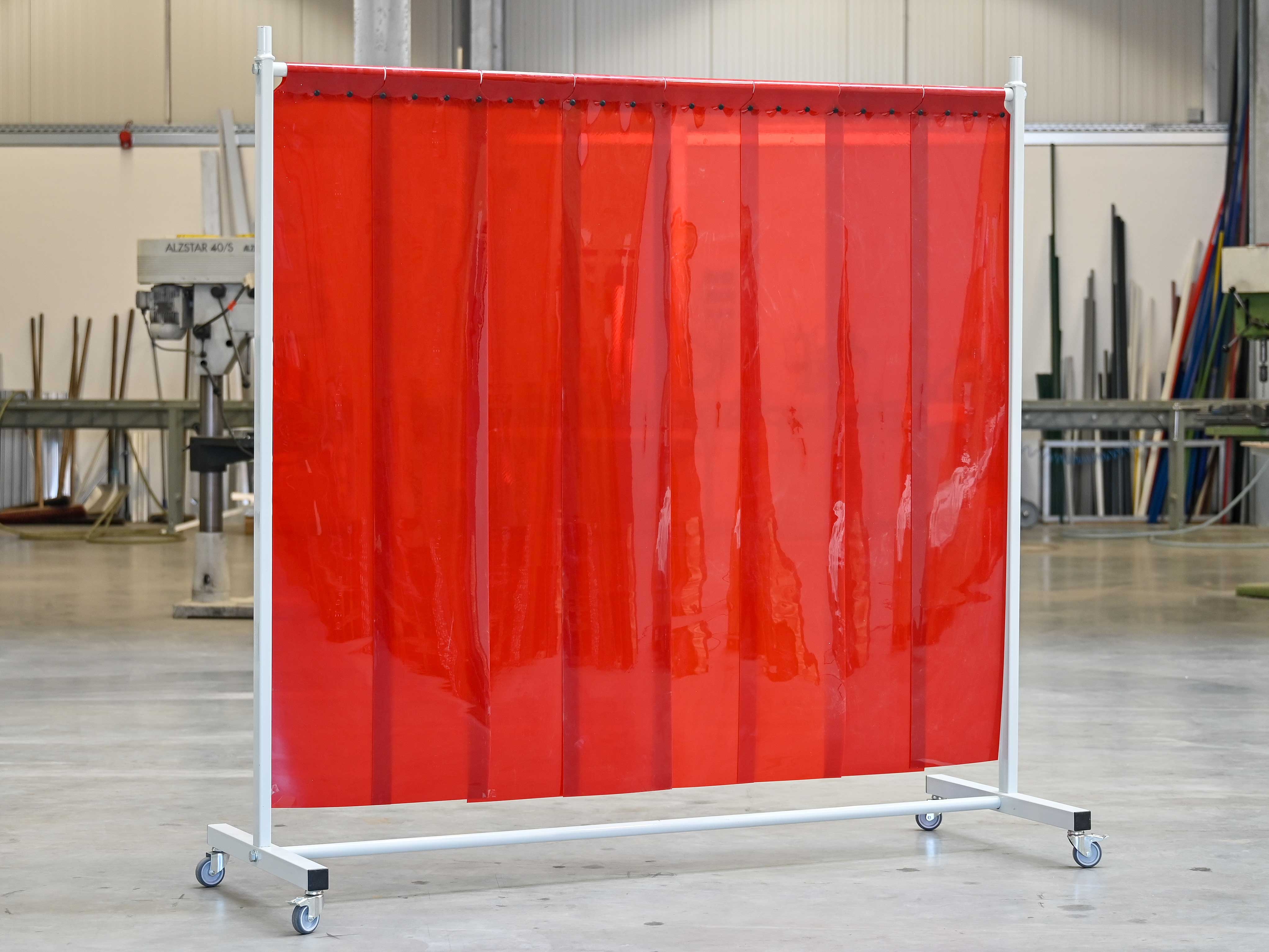 Unsere Schutzwände mit transparenten roten oder matten dunkelgrünen Behängen entsprechen den hohen Sicherheitsstandards der Norm ISO EN 25980 (EN 1598). Beim Lichtbogenschweißen oder bei Schweißabtrennungen ist es entscheidend, dass keine Funken oder Schweißspritzer auf umliegende Flächen gelangen. Unsere mobilen Stellwände mit Spritzschutzdecken bieten optimalen Schutz vor möglichen Schäden oder Verletzungen. Dank ihrer Mobilität sind sie flexibel an verschiedenen Arbeitsplätzen wie in Werkstätten, auf Baustellen oder in Produktionshallen einsetzbar. Die Gestelle sind robust, langlebig und lassen sich einfach montieren.